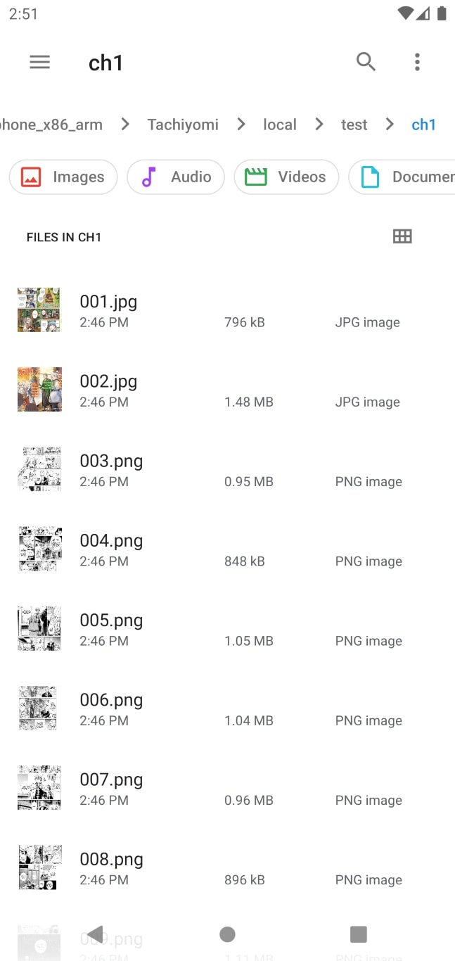 Here, the manga name is test so the file structure is /Aniyomi/local/test/ch1/images.